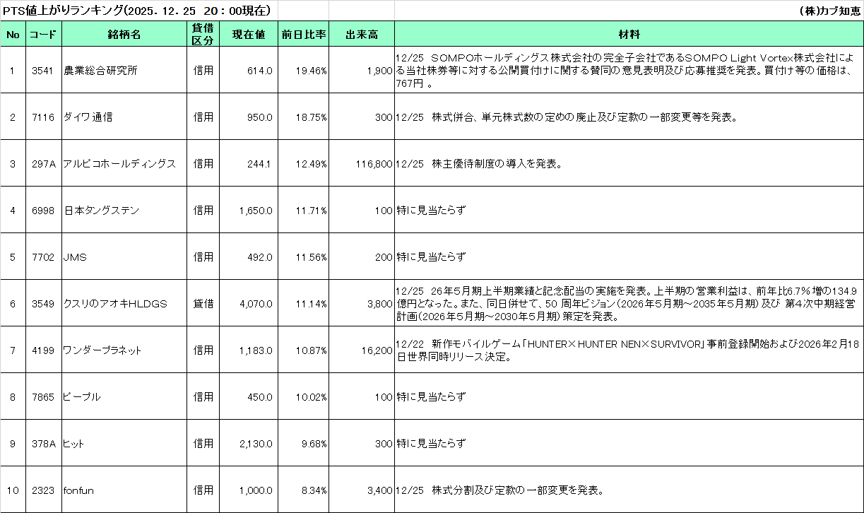 カブ知恵発 PTS値上がりTOP10(2025/12/25)