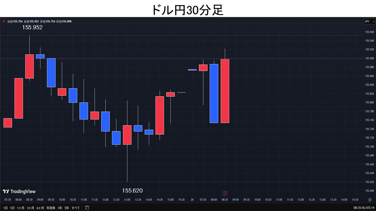 東京時間、日本と中国以外の主要市場が休場ということもあり、動意が薄い中で買いが入るとドル円は155.95円まで上昇。その後は本邦中期金利の上昇を受け155.62円まで下落。