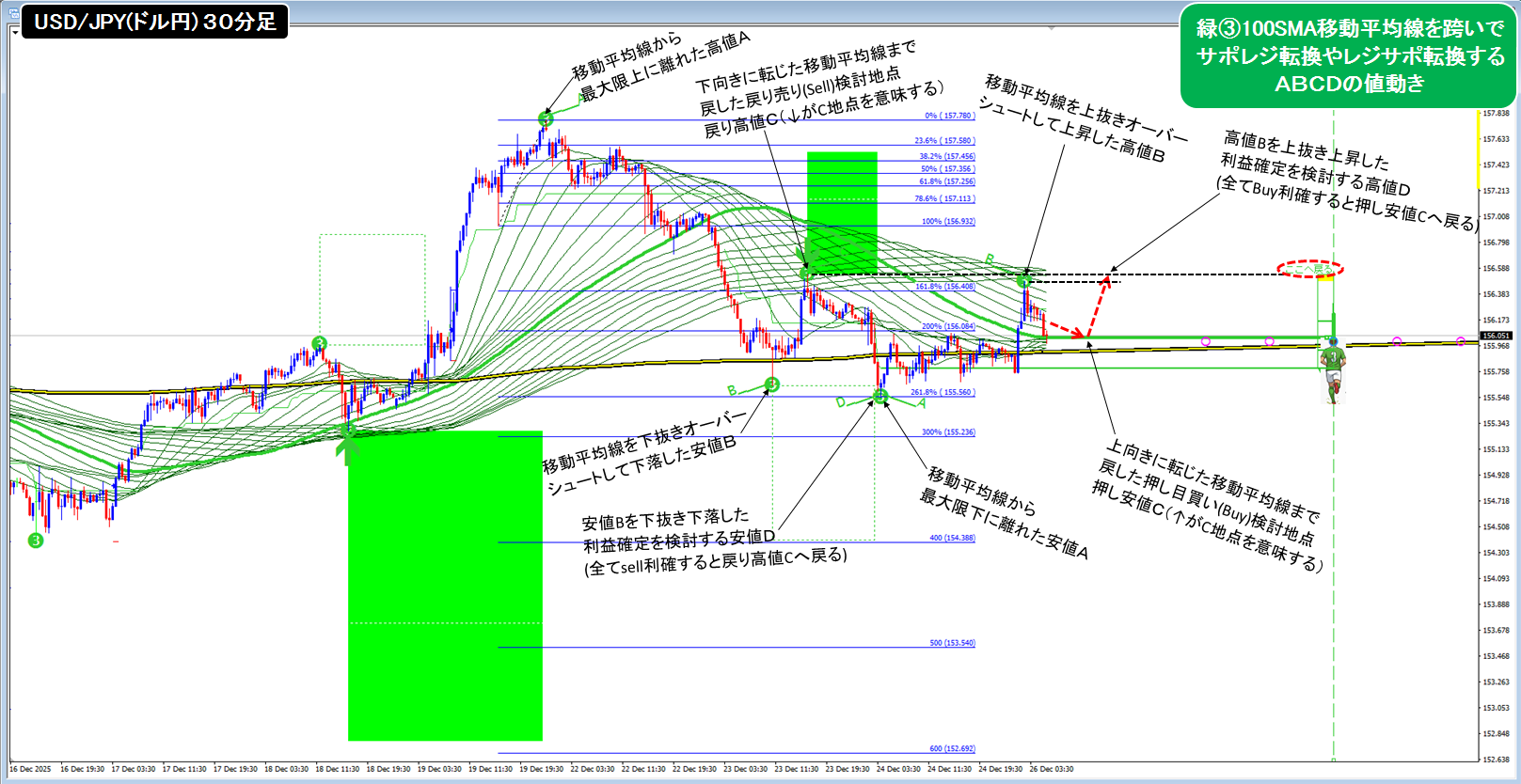 ●このあと緑③100SMA付近でサポートされるときに押し目買い(buy)をして、高値Bを上抜いたここへ戻る(≒戻り高値C)を目指すトレードをしたいと考えていると思われます。