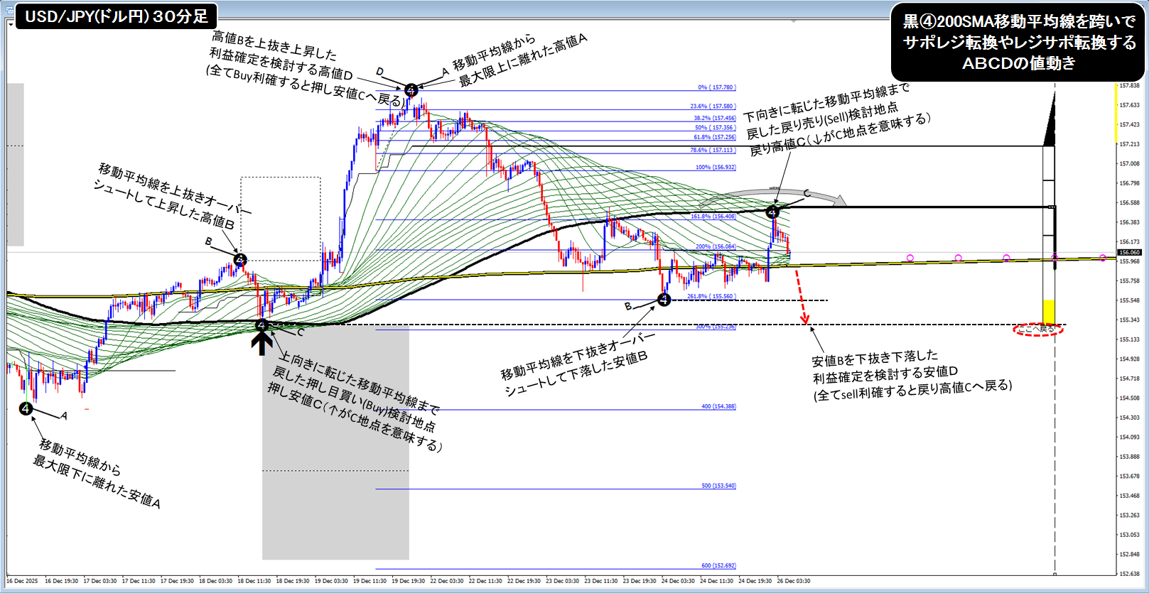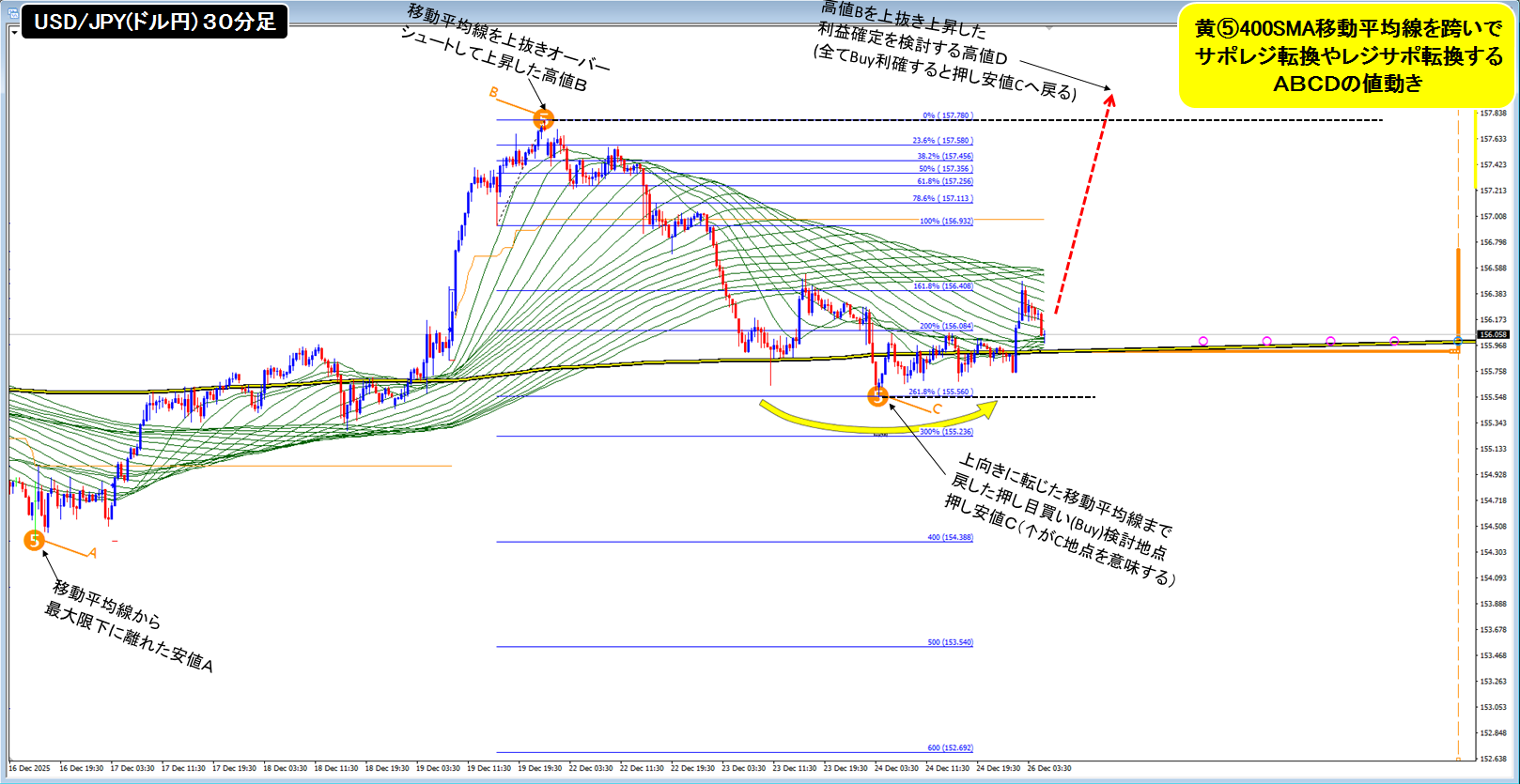 クリスマス後の現在のドル円(30分足)チャートを用いて、大中小の移動平均線(20/50/100/200/400SMA)でのサポレジ転換やレジサポ転換の状況をそれぞれ順に見てみます。