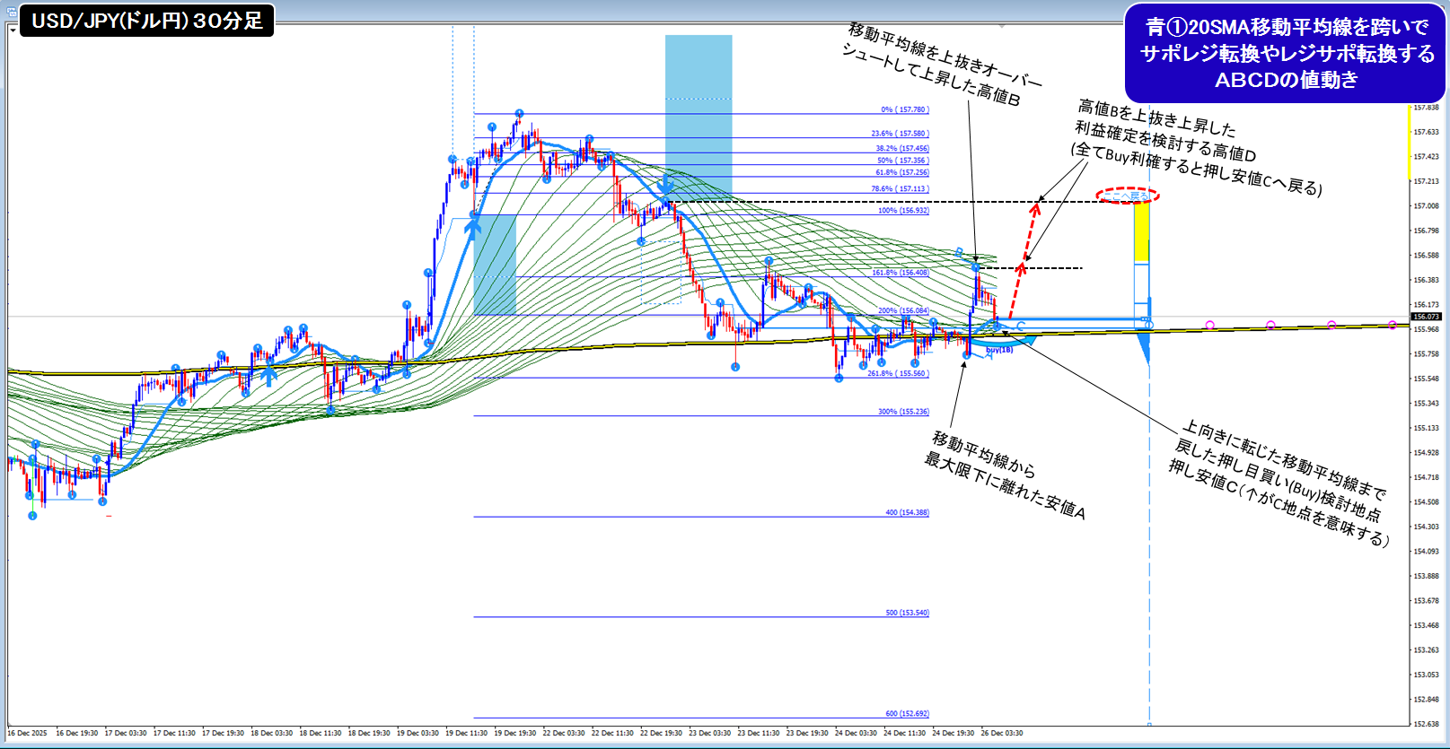 ●このあと赤50SMA付近でサポートされるときに押し目買い(buy)をして、高値Bを上抜いたここへ戻る(≒戻り高値C)を目指すトレードをしたいと考えていると思われます。