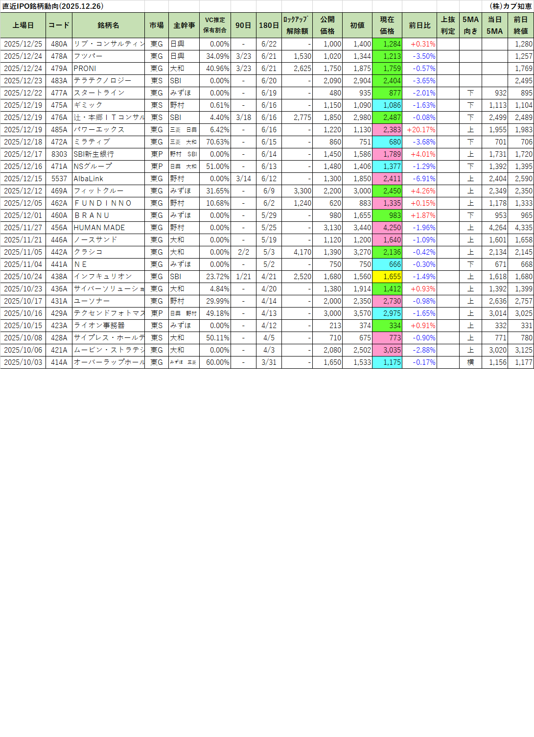 カブ知恵発 直近IPO銘柄動向(2025/12/26)