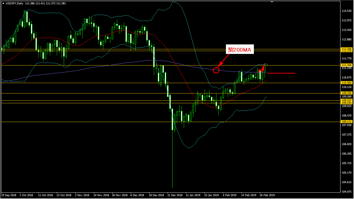 ドル円の日足チャートから見てみます。ドル円日足では、長く頭を抑えられていた機関投資家も注目する唯一移動平均線で強力な壁として機能するとされる200MAを下から上抜けしサポレジ転換したようにも見えます。また更にその上の強めの壁と思われるドル円111.368円のラインも下から上抜けし現値がそのラインの上にあります。このドル円111.368円のラインより上に行くのか下に戻されるのかが注目されます。