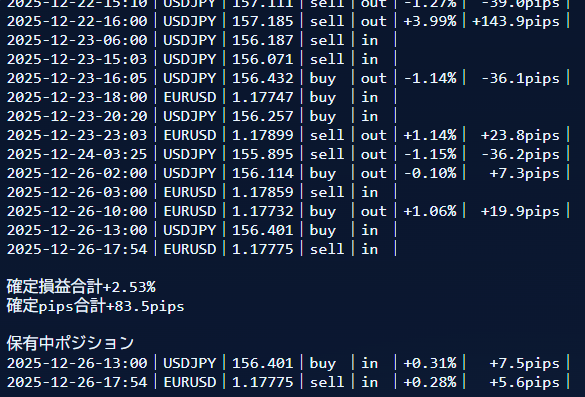 2025-12-26-13:00|USDJPY|156.401|buy |in |+0.31%| +7.5pips|