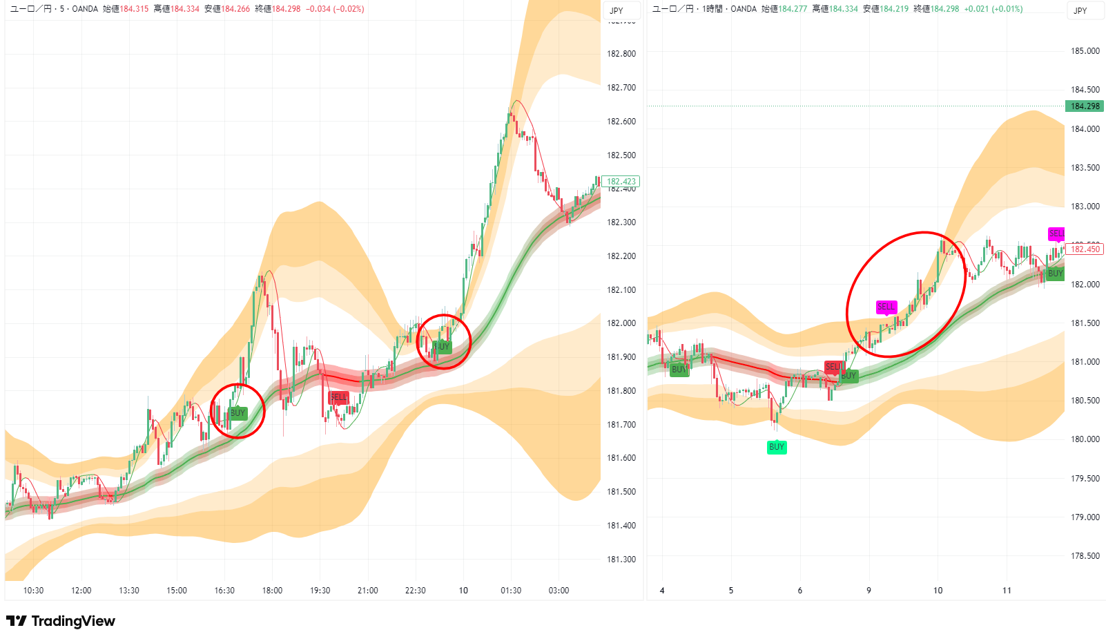 左に5分足、右に1時間足を設定している状態で説明を進めていきます