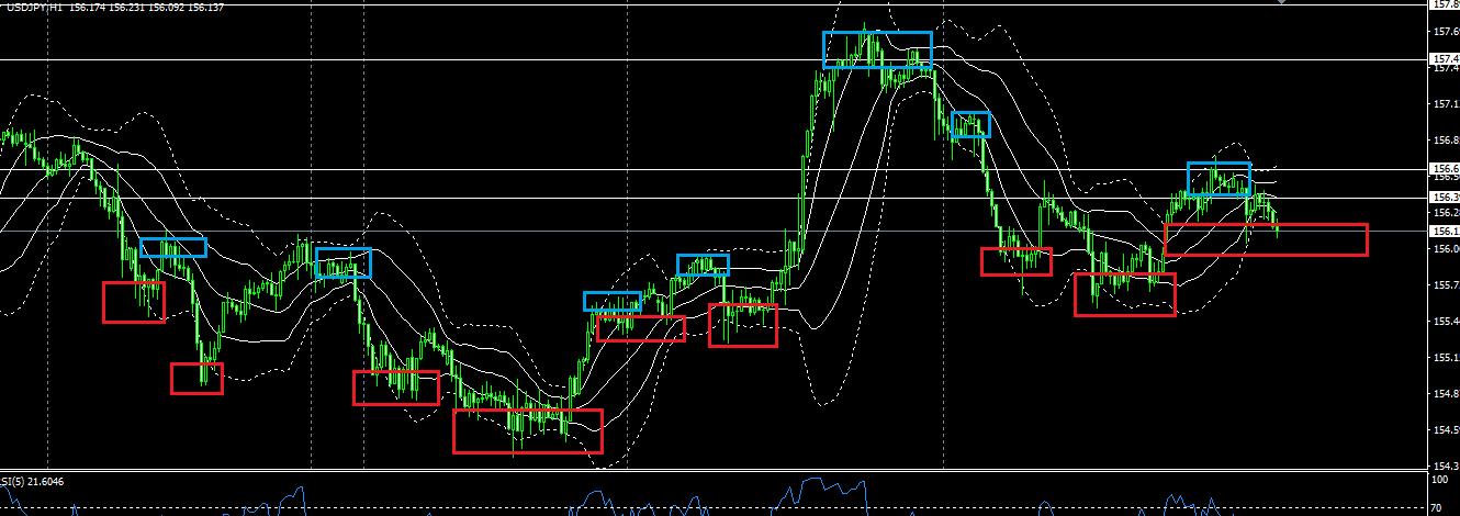 後から見るならどうにでもできるという声が聞こえてきそうですが、実際はその様な考えではなく、毎日こういった場面に拘ってチャートを監視していれば、自ずと青・赤□ゾーンの見え方が分かってきます。