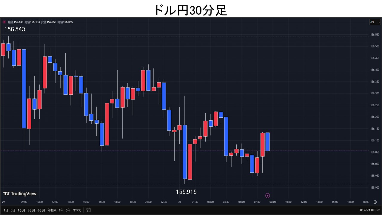 NYダウ平均続落等を受け、ドル円は一時155.91円まで反落。