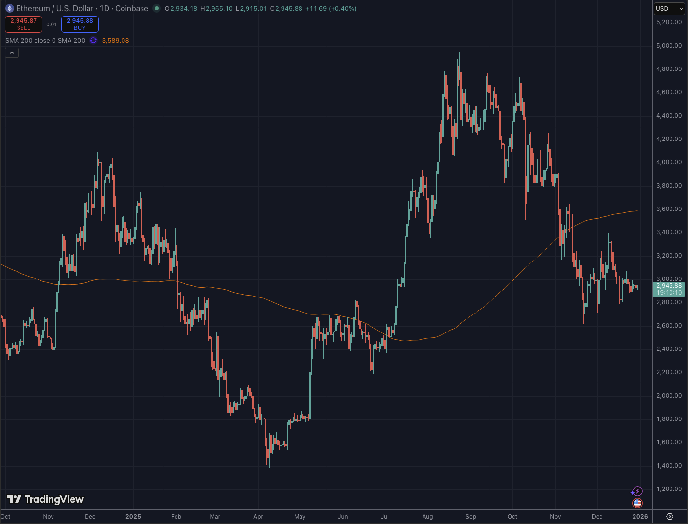 イーサリアムについても、ビットコインと同様に3,000ドルという重要な節目価格の水準で値動きが収束しています。クリスマスから年末年始にかけては市場全体の流動性が極端に少なくなっており、ボラティリティ(価格変動幅)が抑えられています。ただし、流動性が低いということは、まとまった大口注文が入った際に価格が一方へ過剰に振れるリスクも孕んでいるため、注意が必要です。
