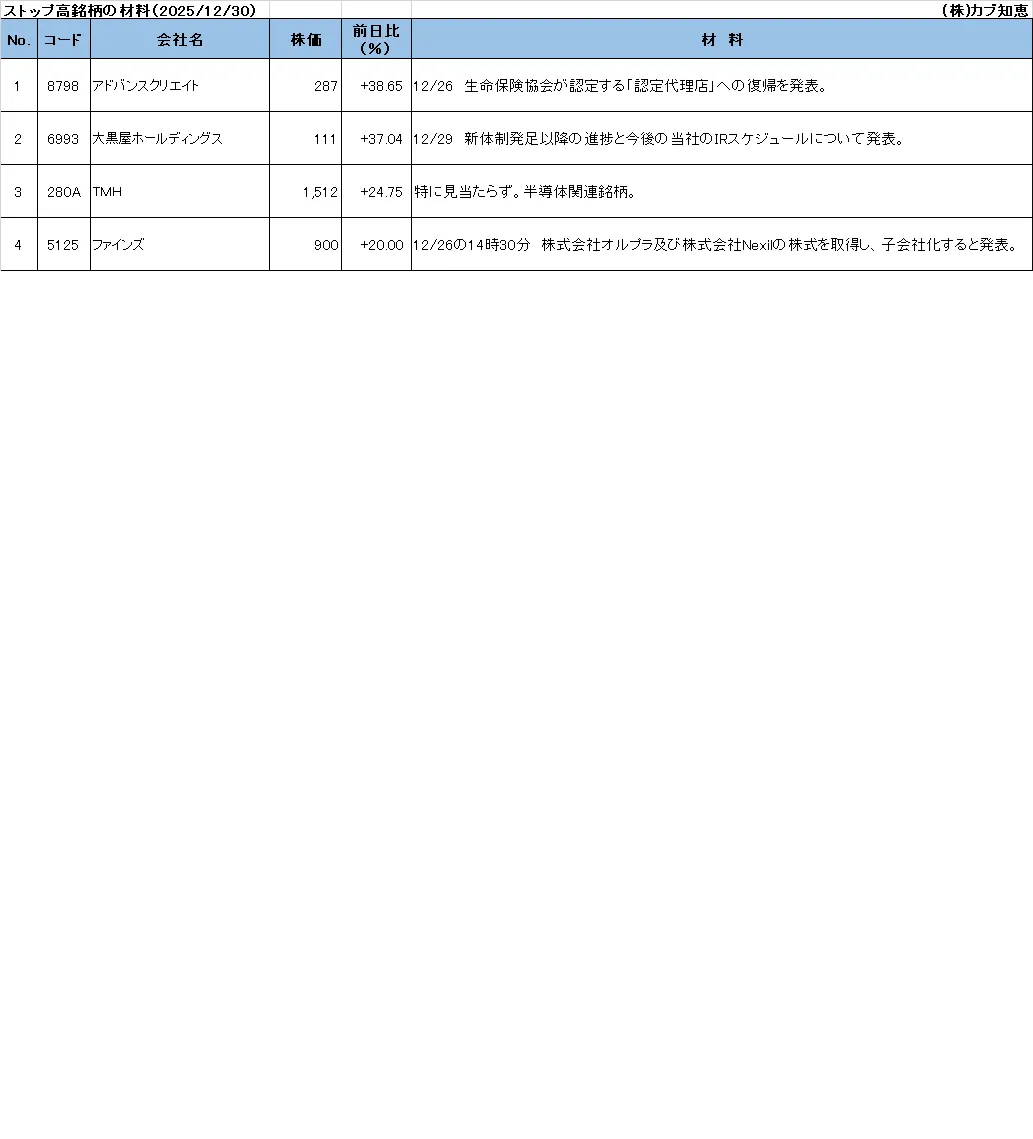 カブ知恵発 ストップ高銘柄の材料(2025/12/30)