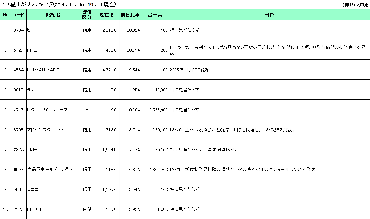 カブ知恵発 PTS値上がりTOP10(2025/12/30)
