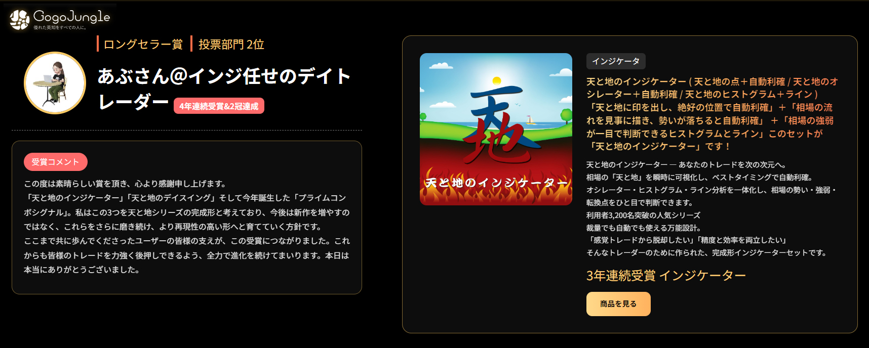 ・天と地のインジケーターとは2022年2月に発売された私あぶさんが開発したオリジナルインジケーターを使用したトレード手法です。皆様の応援のお蔭で「GogoJungle Award 2022、2023、2024、2025」を4年連続で受賞させていただきました。