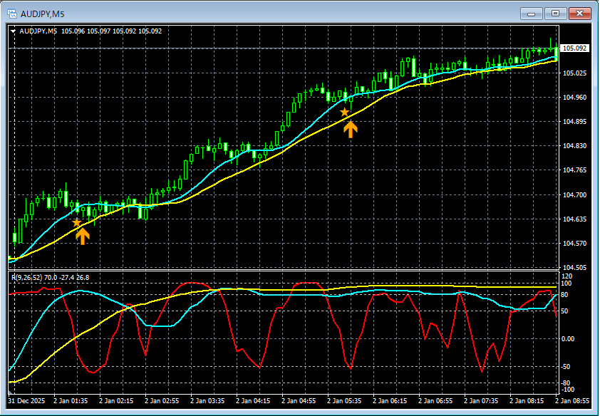 【RCIを極めて移動平均線フィルターで勝つ!!】本日の豪ドル円 5分足 mBDSRのサイン