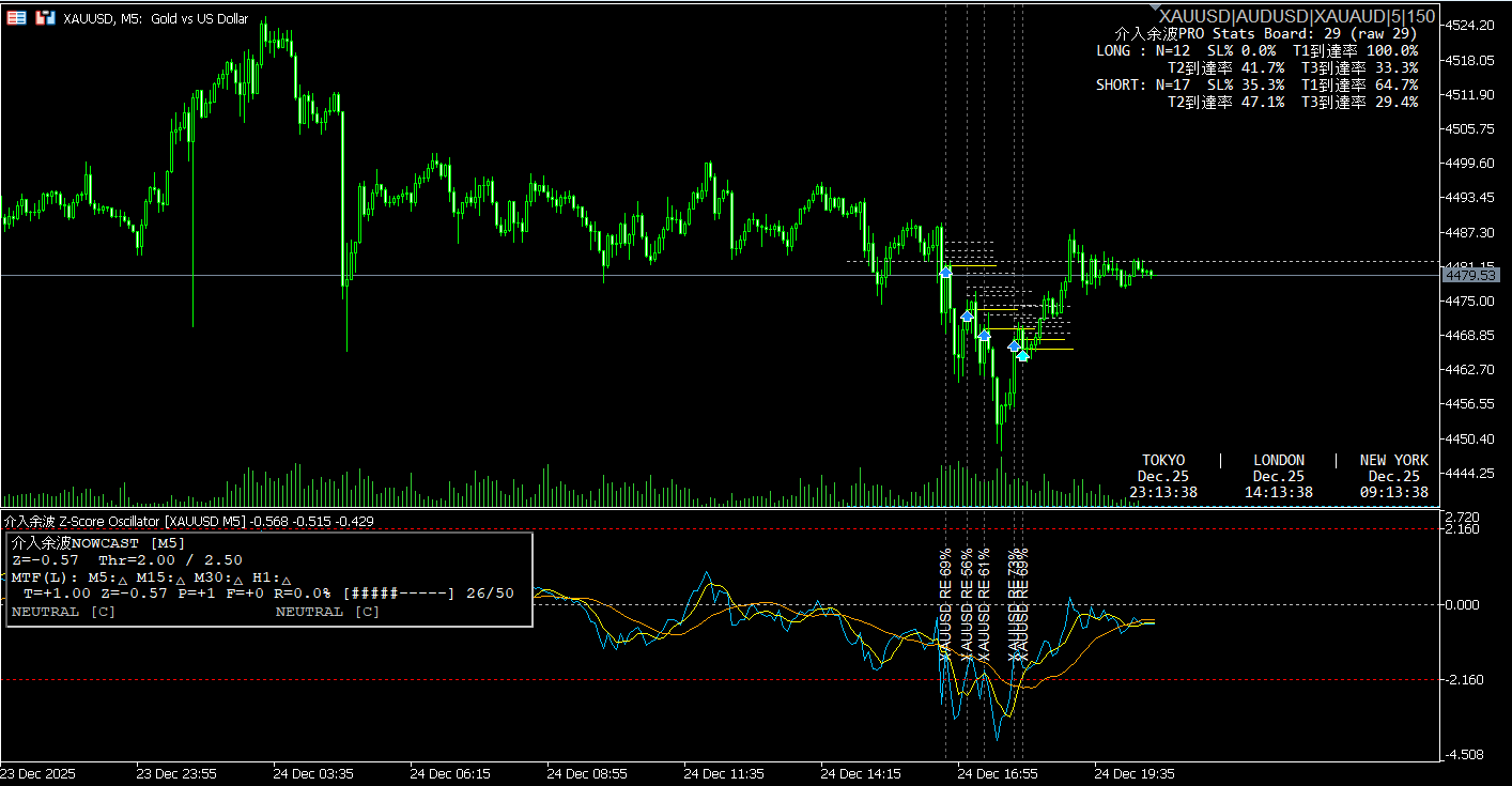 一方でMT4は、他シンボル参照自体はできても、複数シンボルをティック単位で同期しながら同じ思想で安定運用/再現検証する、という用途に強い前提ではありません。だからこそ「裏で3ペア解析が常に走る」という中核機能は、MT5専用として実装しています。