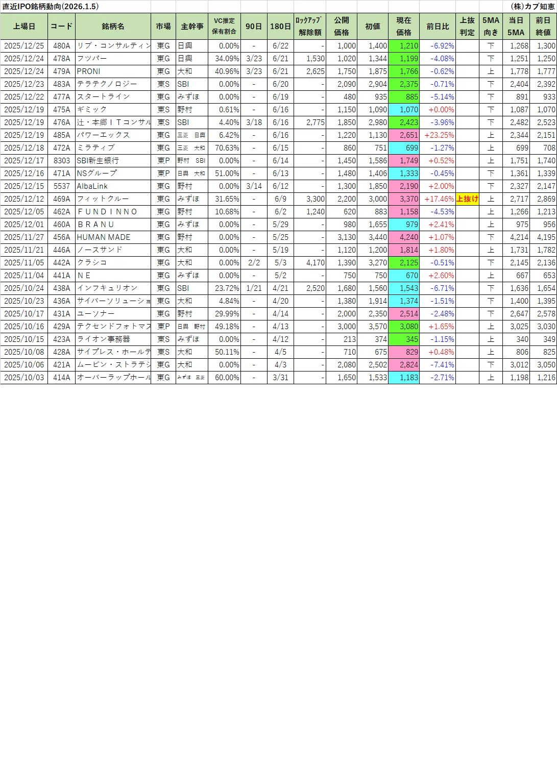 カブ知恵発 直近IPO銘柄動向(2026/01/05)