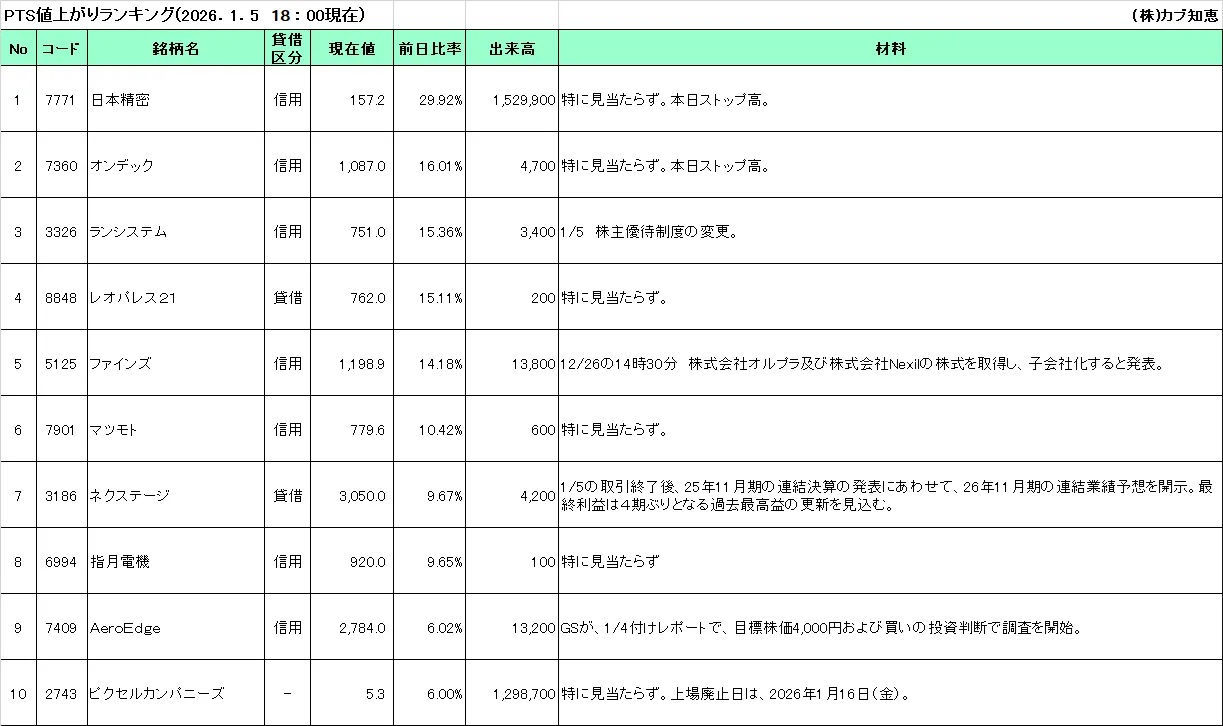 カブ知恵発 PTS値上がりTOP10(2026/01/05)