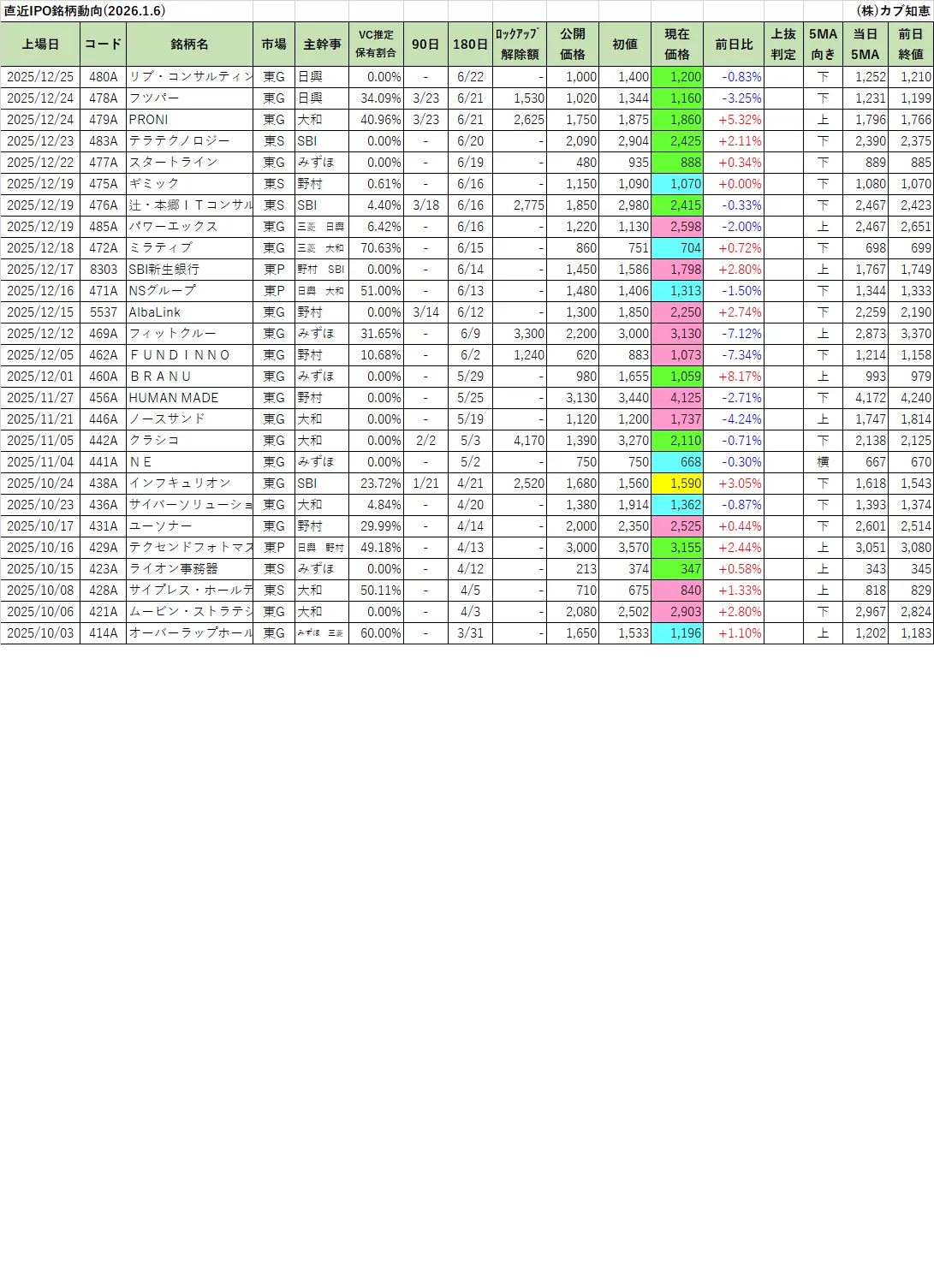 カブ知恵発 直近IPO銘柄動向(2026/01/06)
