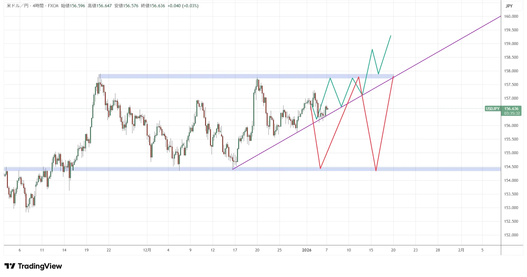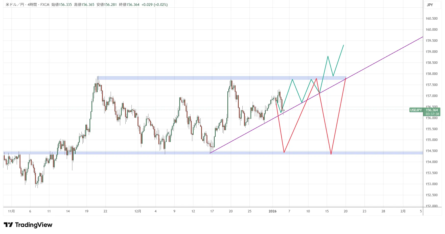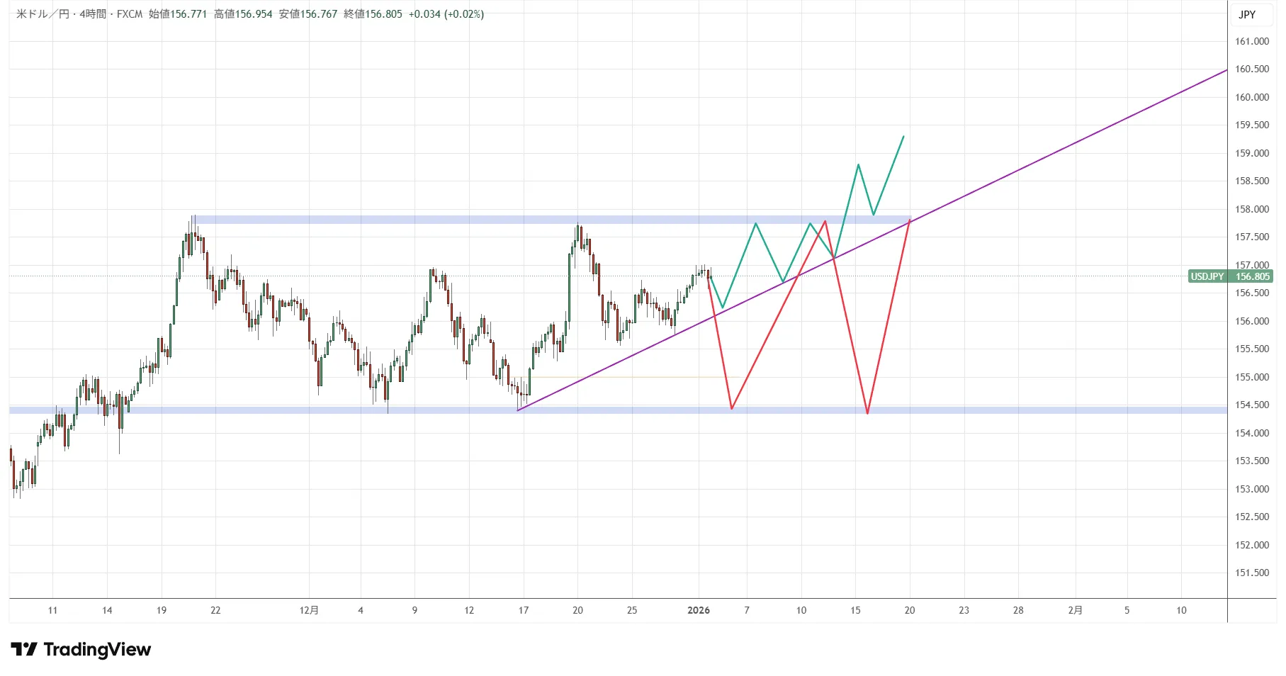 ドル円の分析です。 依然としてレンジ内で動いています。 現時点では、4時間足で見ると、少しずつ上昇の圧力があるようにも見えます。 紫のトレンドラインが効いていれば、アセンディングトライアングルを作りながら上へ抜けていくと思われます。 (緑のライン) もし、このトレンドラインが効いていなければ、そのまま下に抜けてレンジに戻ります。 個人的にはアセンディングトライアングルを作っていってもらう方がわかりやすいです。 このトレンドラインが効いているかどうかが、鍵になりそうです。