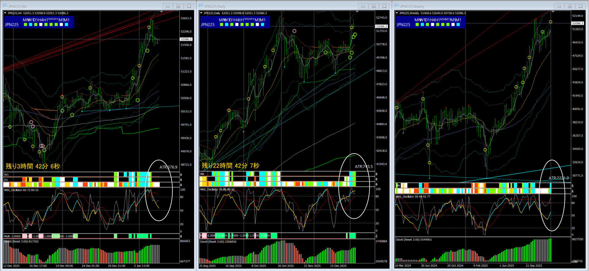 日足のMAXオシレーター野市が高く、MKチャネル偏差3倍
