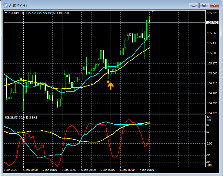 【RCIを極めて移動平均線フィルターで勝つ!!】直近の豪ドル円 1時間足 mBDSRのサイン