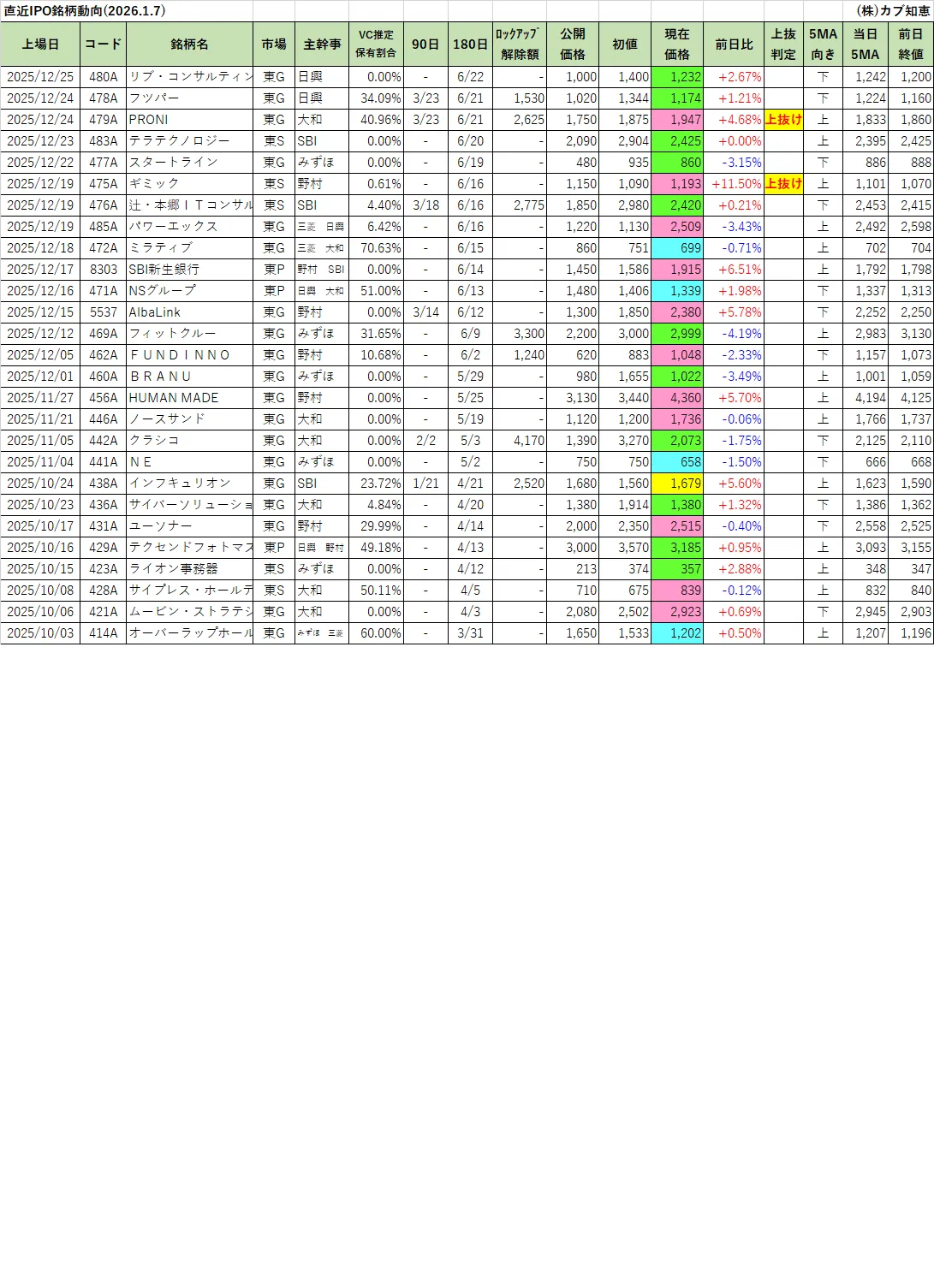 カブ知恵発 直近IPO銘柄動向(2026/01/07)