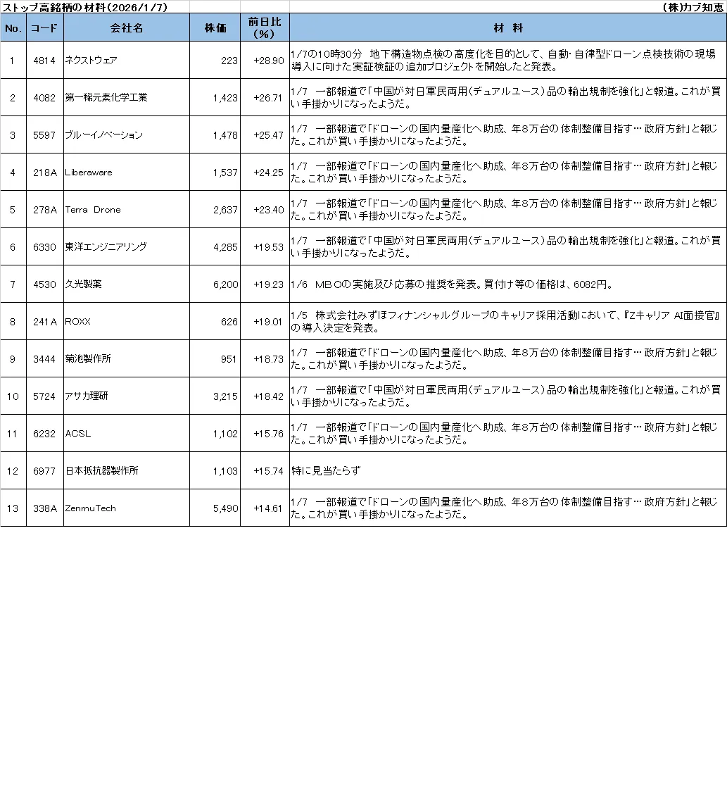 カブ知恵発 ストップ高銘柄の材料(2026/01/07)