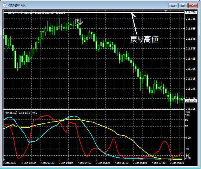 百戦錬磨【RCIを極めて勝つ!!】ポンド円 5分足 戻り高値付近からの下げとR1R2S2のサイン