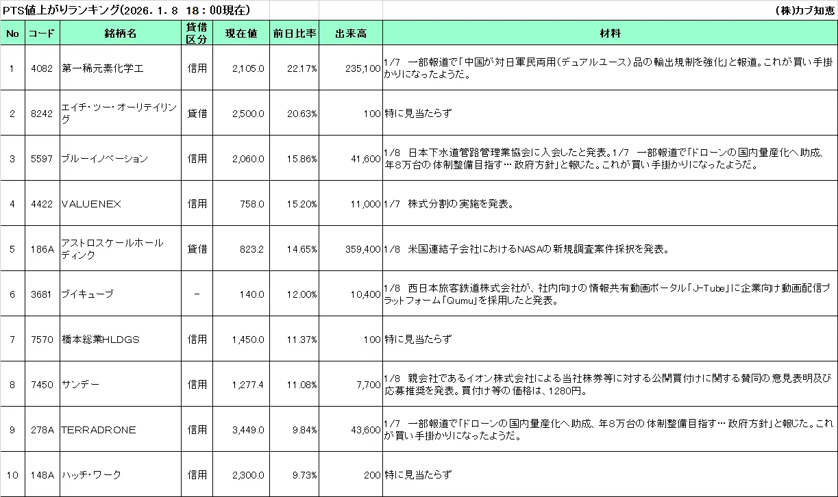 カブ知恵発 PTS値上がりTOP10(2026/01/08)