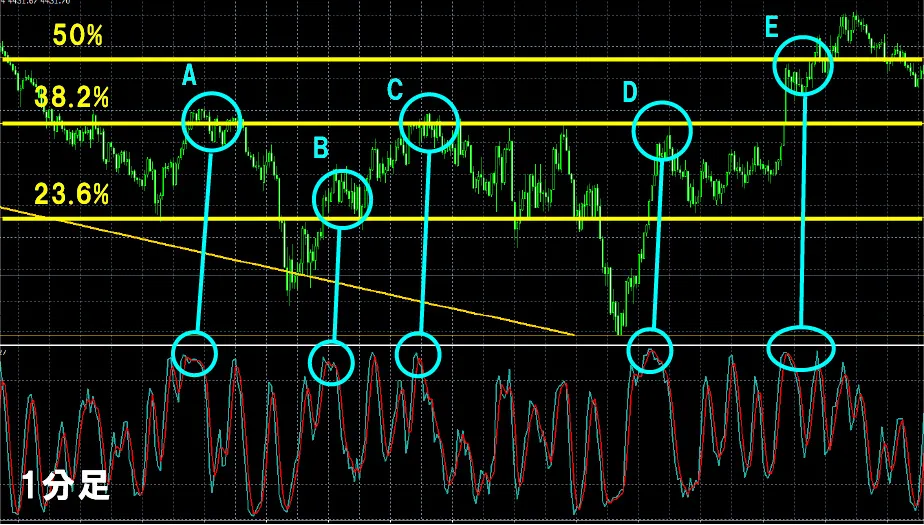 ・エントリー条件:ストキャスの戻り+フィボナッチラインへのタッチ