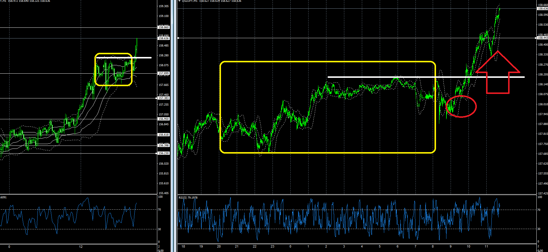 NY時間の高安値を意識して、東京スタートでどちらへ動くのか、動いたらブレイクを狙うのか、ブレイク後の押し目を出来高を見ながらポするのか、この辺りは「億トレーダーのスキャルピング」で売り買い転換後の初動を狙って行けます。