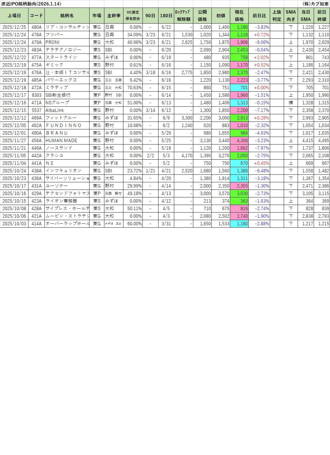 カブ知恵発 直近IPO銘柄動向(2026/01/14)