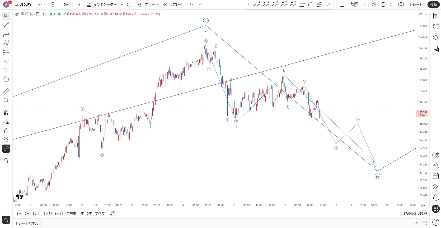 青C波内部は暫定で灰インパルスとカウントしていますが、ダイアゴナルの可能性もあります