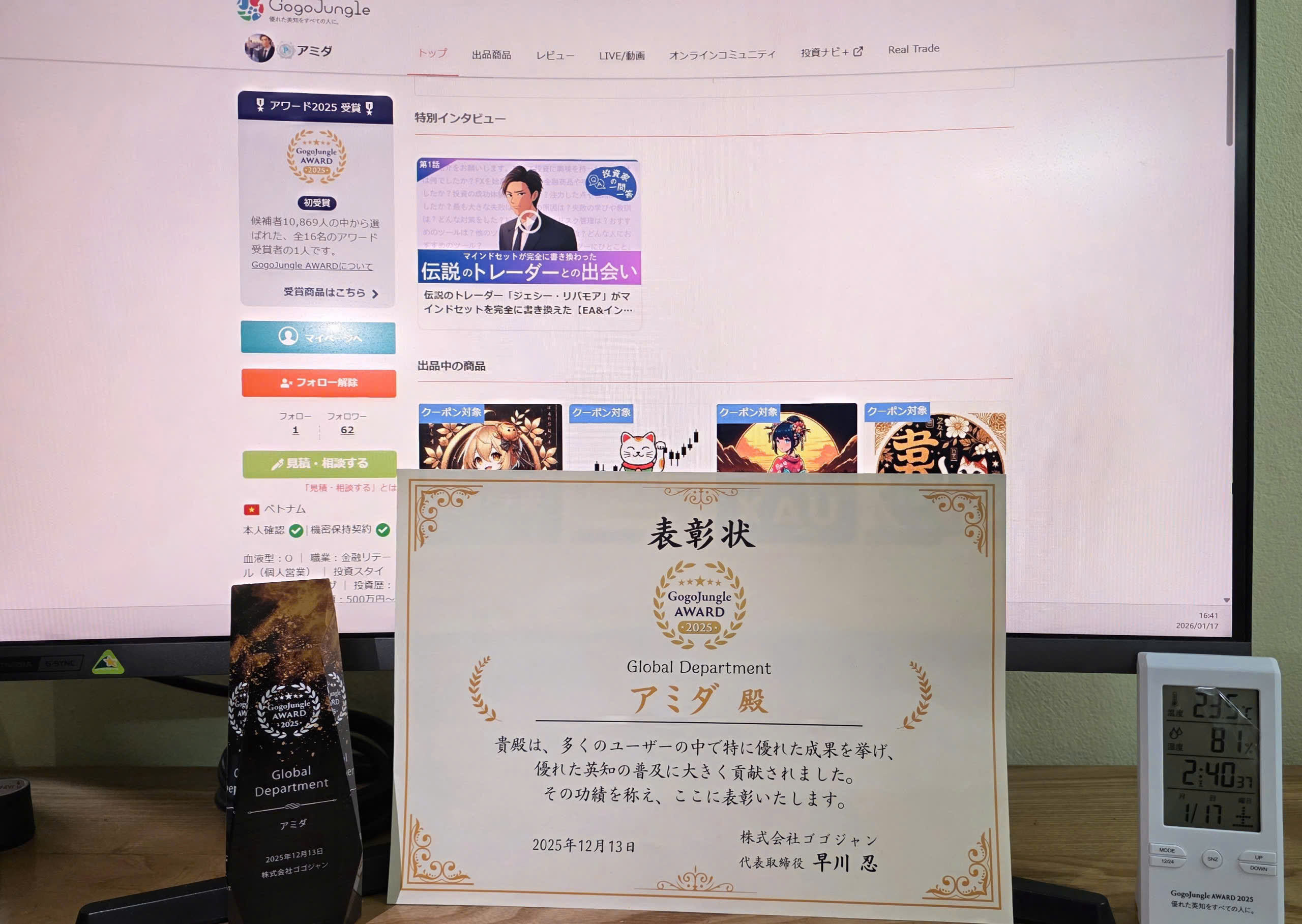 いつもGogoJungleをご利用いただき、誠にありがとうございます。 このたび、GogoJungle AWARD 2025 において、 Global Department Excellence として表彰いただきました。 本アワードは、多くの出品者・トレーダーの中から、 実績・安定性・継続的な貢献 が評価された開発者に贈られるものです。 このような名誉ある賞を受賞できたことを、大変光栄に思っております。