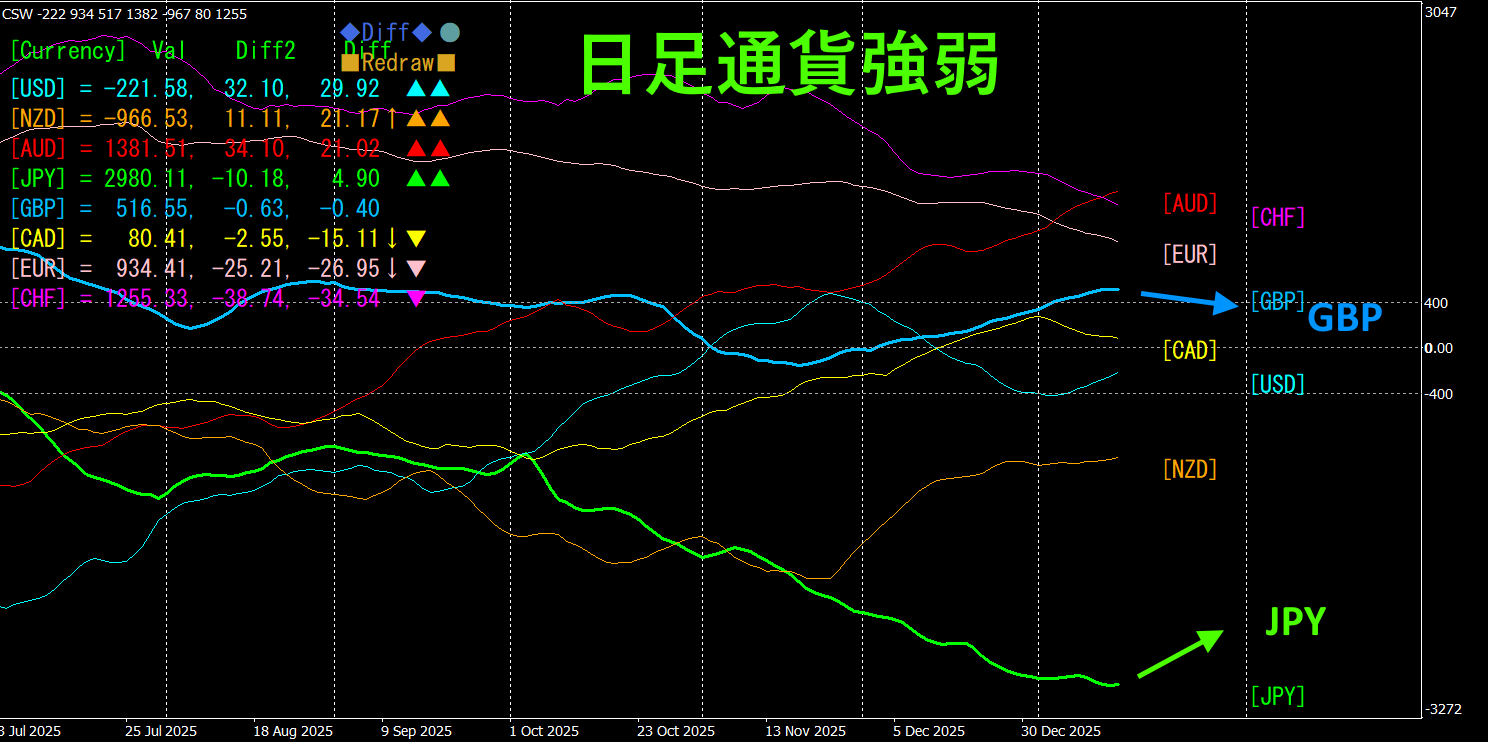 日足通貨強弱チャートでも、GBPは下に、JPYは上に向かっているので、乖離のステージが終了し、ここから収束のステージが始まると見なすことができます。日足トレードなら、GBPJPYを売り建てることになります。