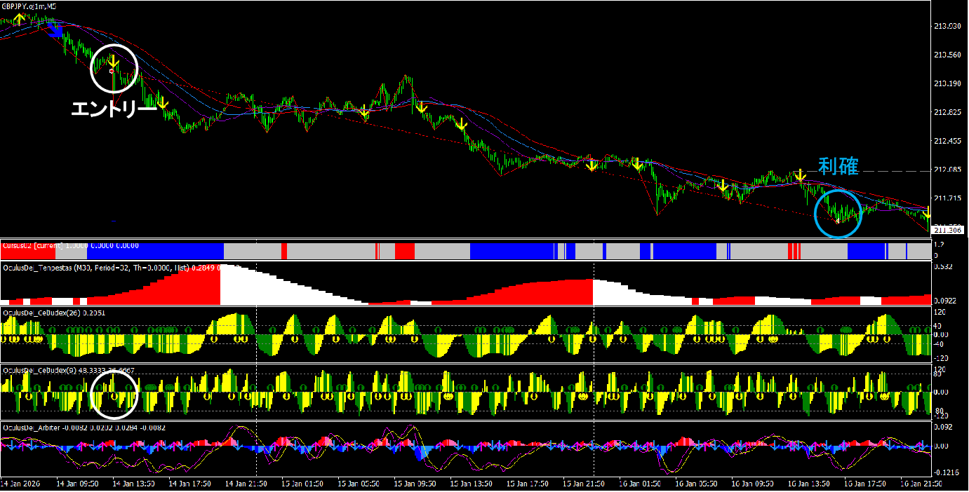 4時間足のCelJudex(26)の売りサイン、またはArbiterのデッドクロスを相場環境の目安とし