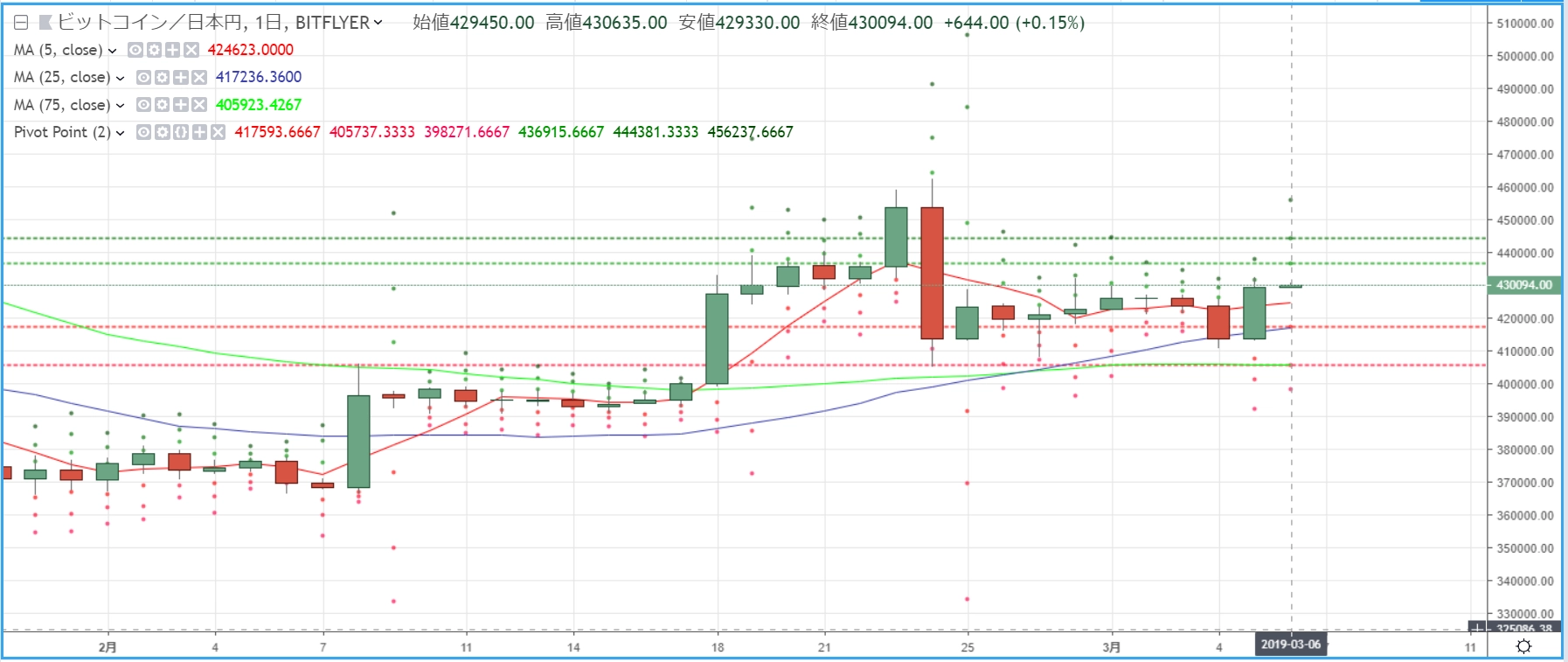 画像は2019年3月7日のキャプチャ。昨日は主要どころ(ビットコイン、ビットコインキャッシュ、イーサリアム、リップル、ライトコイン)が3~15%の上昇となっています。今日はイーサリアムがかろうじて「緑」、ライトコインが5%超の上昇、ビットコイン、ビットコインキャッシュ、リップルは1%未満の下落で「赤」となっています。