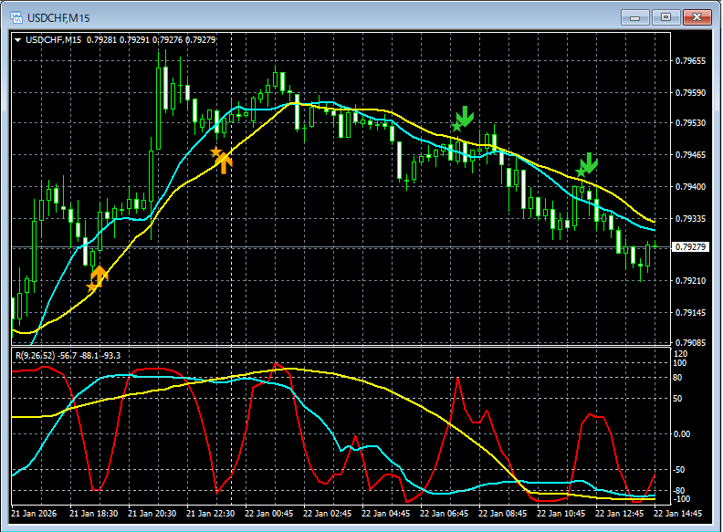 【RCIを極めて移動平均線フィルターで勝つ!!】ドルスイス USDCHF 15分足 mBDSRのサイン