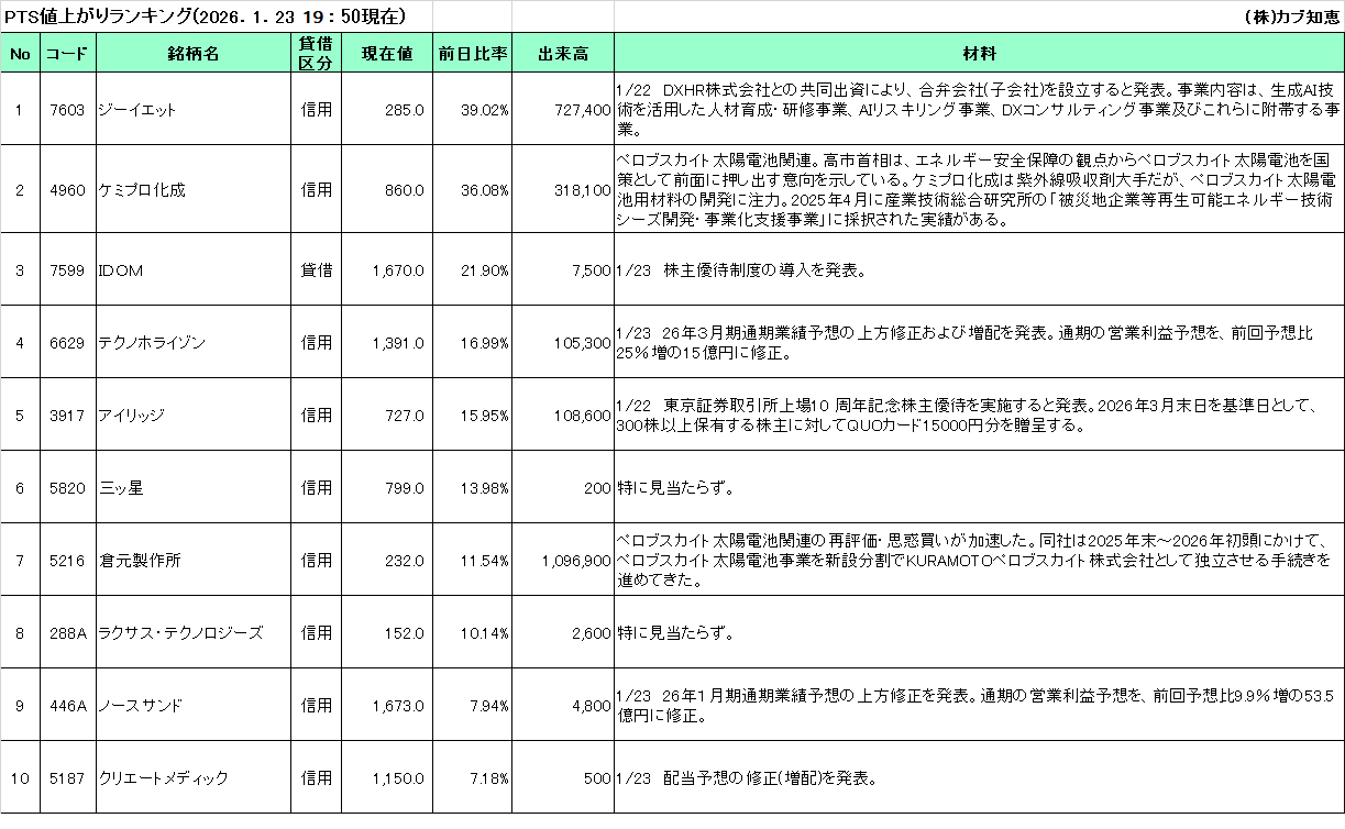 カブ知恵発 PTS値上がりTOP10(2026/01/23)