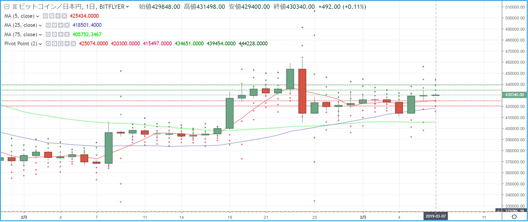 画像は2019年3月8日のキャプチャ。昨日は主要どころ(ビットコイン、ビットコインキャッシュ、イーサリアム、リップル、ライトコイン)が上昇と下落を交えた相場環境となっていました。今日もその流れが続き、主要どころは-1~2%になっています。