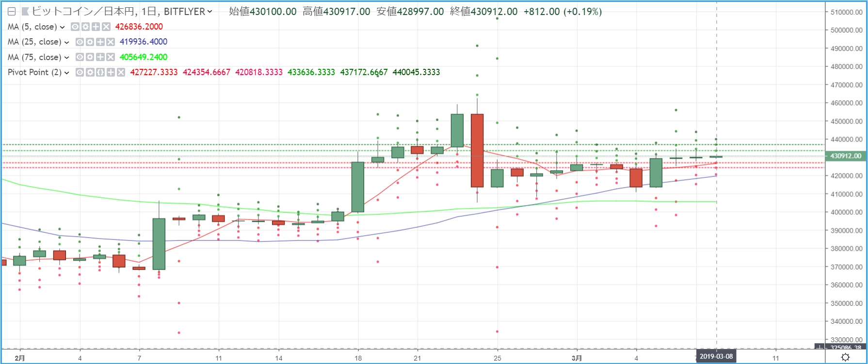 画像は2019年3月8日のキャプチャ。昨日は主要どころ(ビットコイン、ビットコインキャッシュ、イーサリアム、リップル、ライトコイン)が-1~2%の変動でした。今日はその流れが引き続き、-1~2%と「赤」が目立つの相場環境となっています。