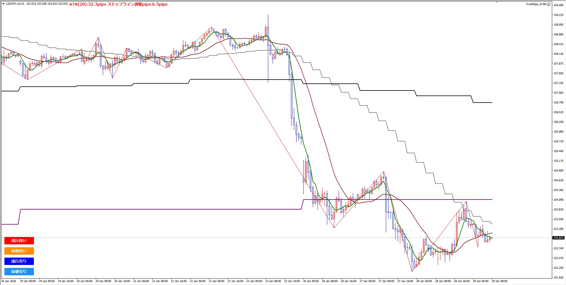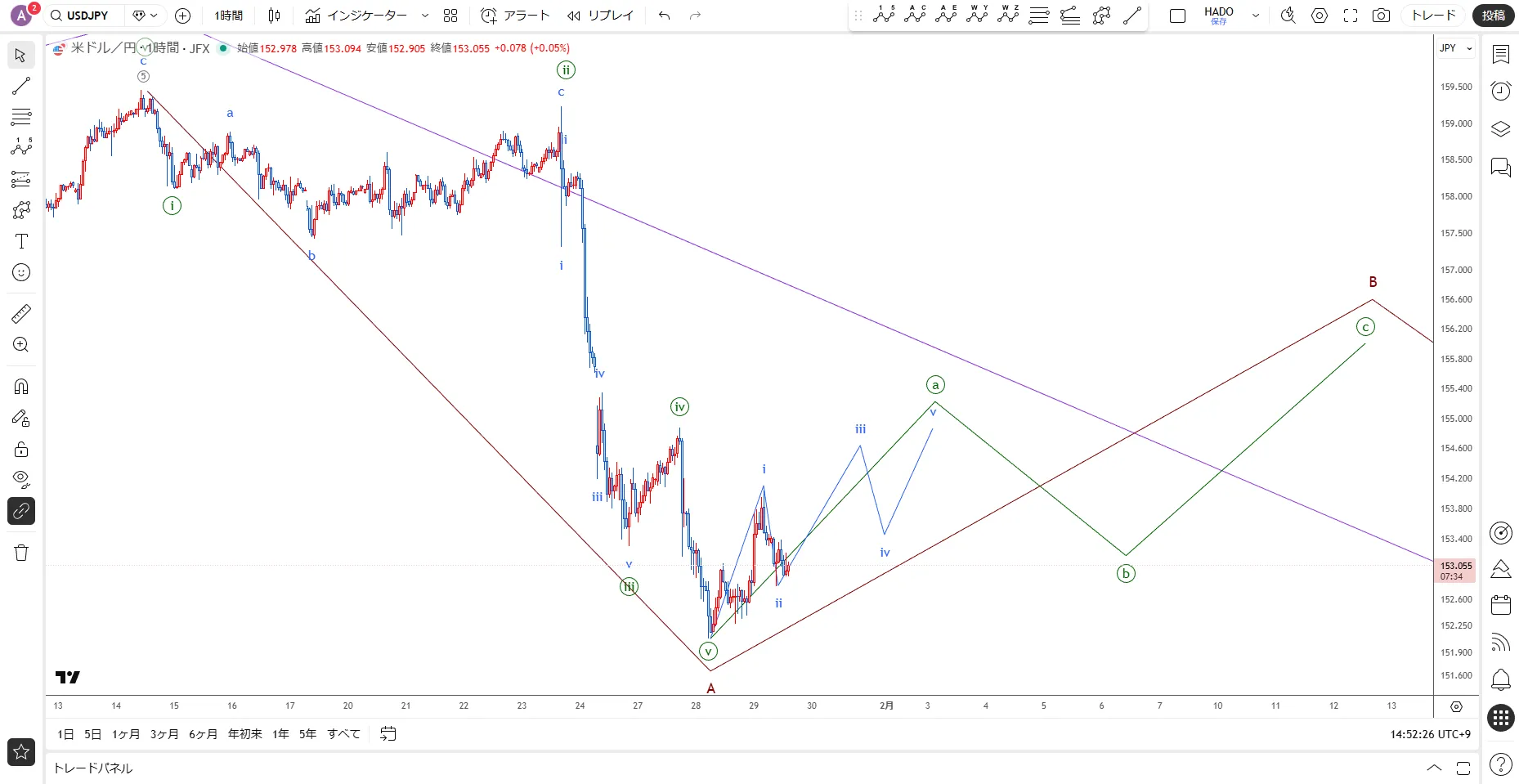 【ドル円】エリオット波動分析と合わせて見るとよく分かるテクニカル / 1月29日(木)エリオット波動分析