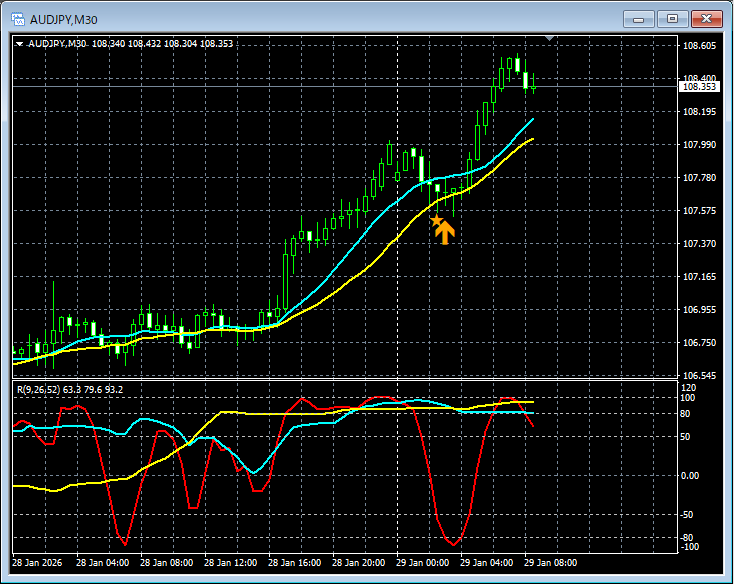 【RCIを極めて移動平均線フィルターで勝つ!!】直近の豪ドル円 AUDJPY 30分足 mBDSRのサイン