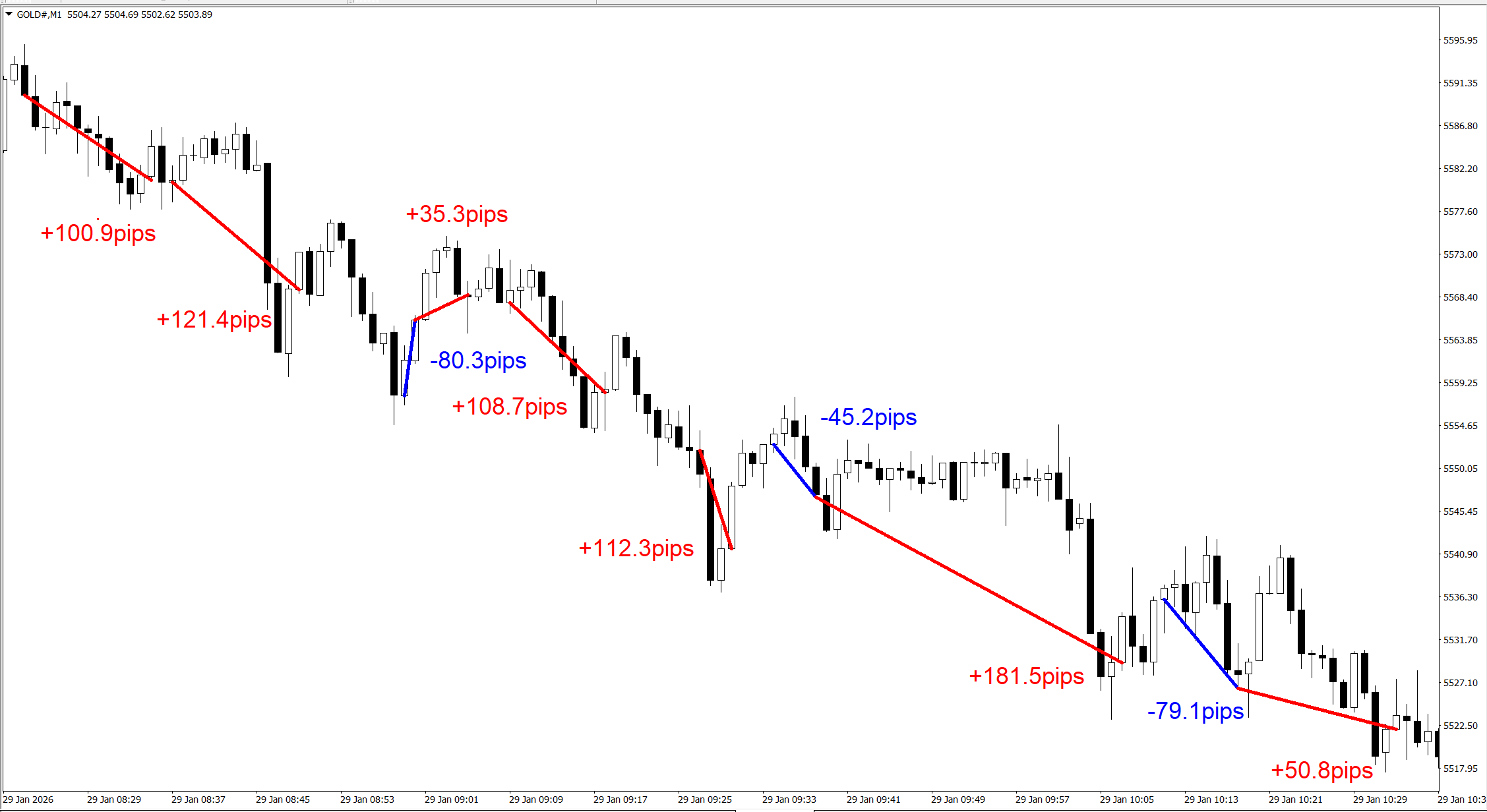 約2時間のトレードで、10回トレードし、+506.3pipsとなりました。