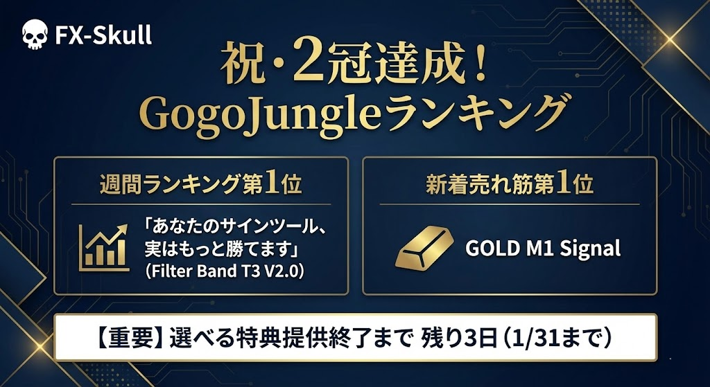 本日、大変嬉しいご報告がございます。皆様のご支持により、当方の開発したインジケーターが以下の通り、GogoJungleにてダブル1位を獲得いたしました。