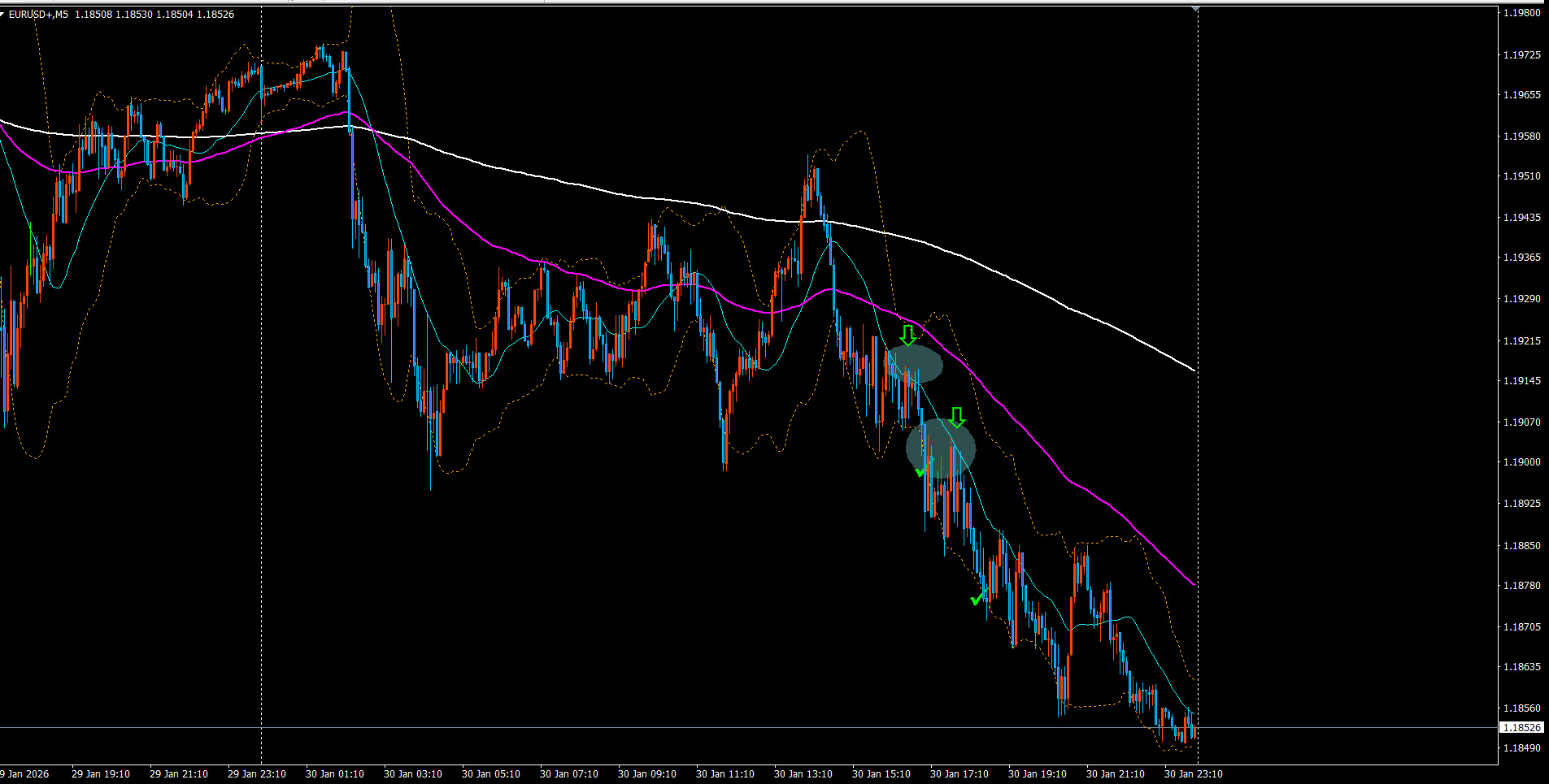 1月31日 おはようございます。昨日の検証です。 【ユーロドル】 2点のエントリーについて、☆☆の捉え方についてシェアします。それぞれ〇〇を引いています。 ①上の楕円は、20SMAと重なっています。さらに、鉄板となっておりますので、こういうときは売りで入って問題ないです。 決済はその下の〇〇まで引っ張れるとGOODです。MAXで16~17ピプスです。 ②黄色のラインは、基本形のローリバラインです。さらに、その下にも〇〇が引けます。 この2点と20SMAが重なっており、且つ〇〇が〇になっています。 複数の条件が多く、獲りやすいところです。〇〇で決済しても25ピプスくらい獲れています。 条件が多ければ多いほど期待値が高く、決済まで伸びていきますので検証してみてください。