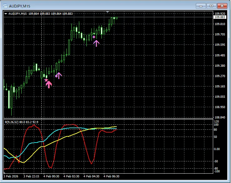 百戦錬磨 mBDSR(RCI2本フィルター)のサインとR1R2S2のサインの両方を活用する(97) 豪ドル円 AUDJPY 15分足