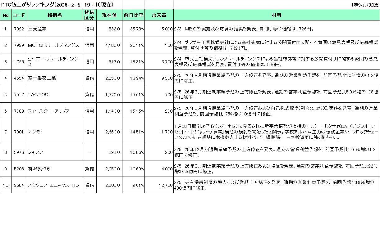 カブ知恵発 PTS値上がりTOP10(2026/02/05)
