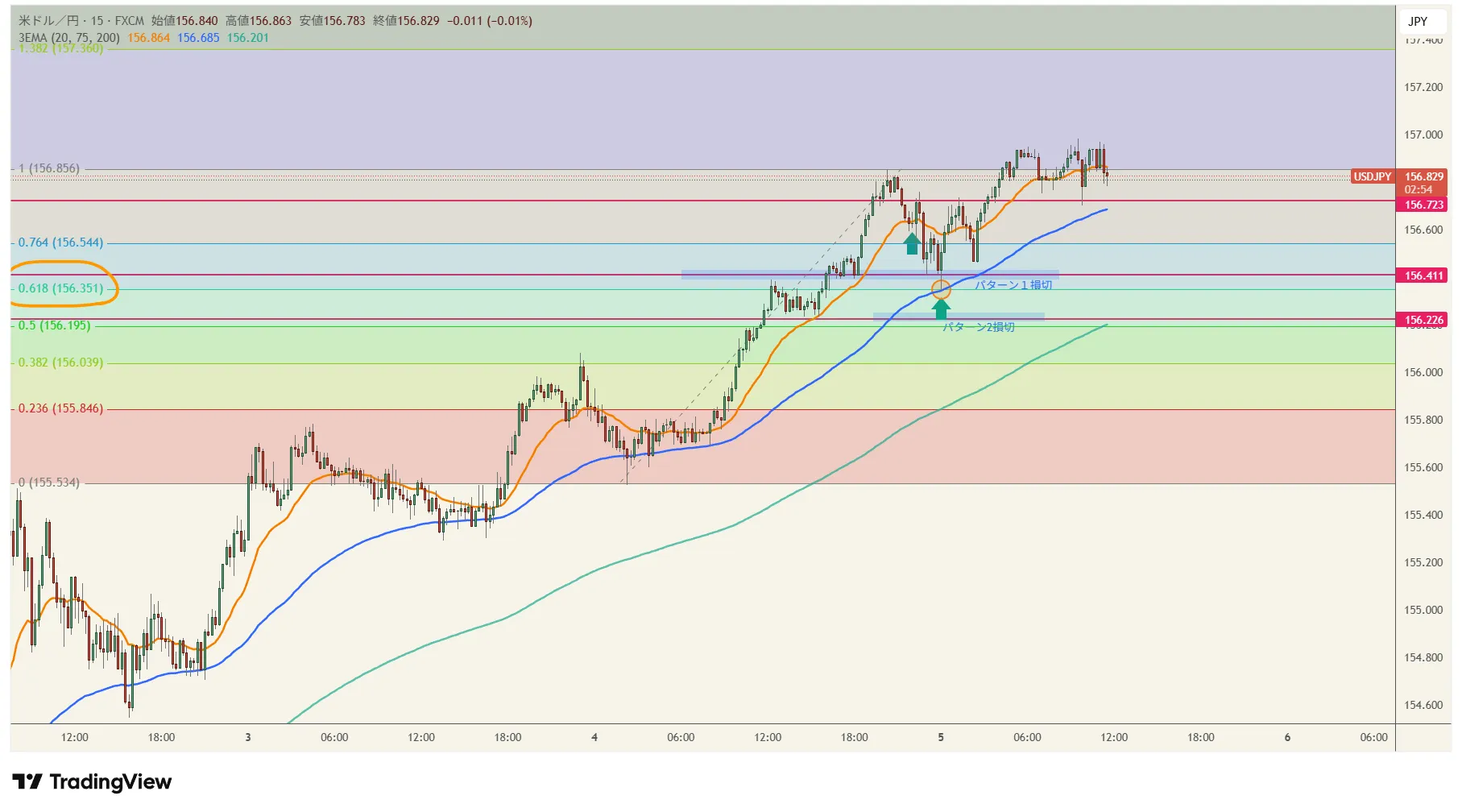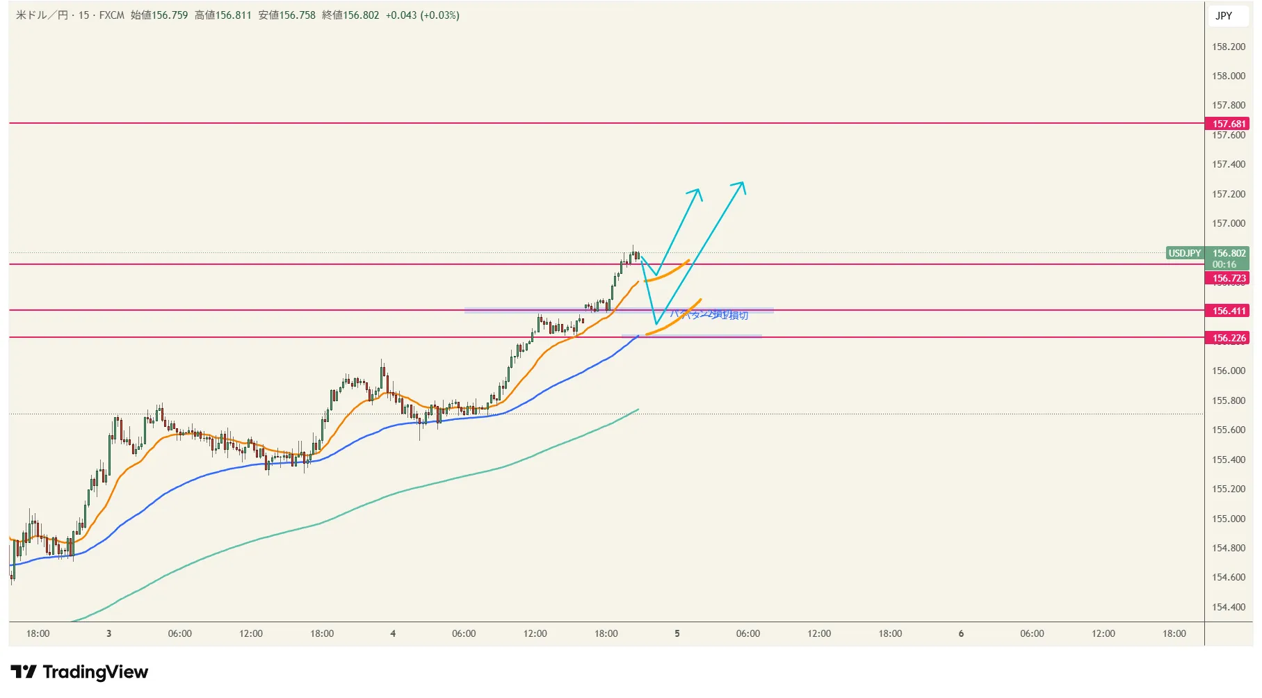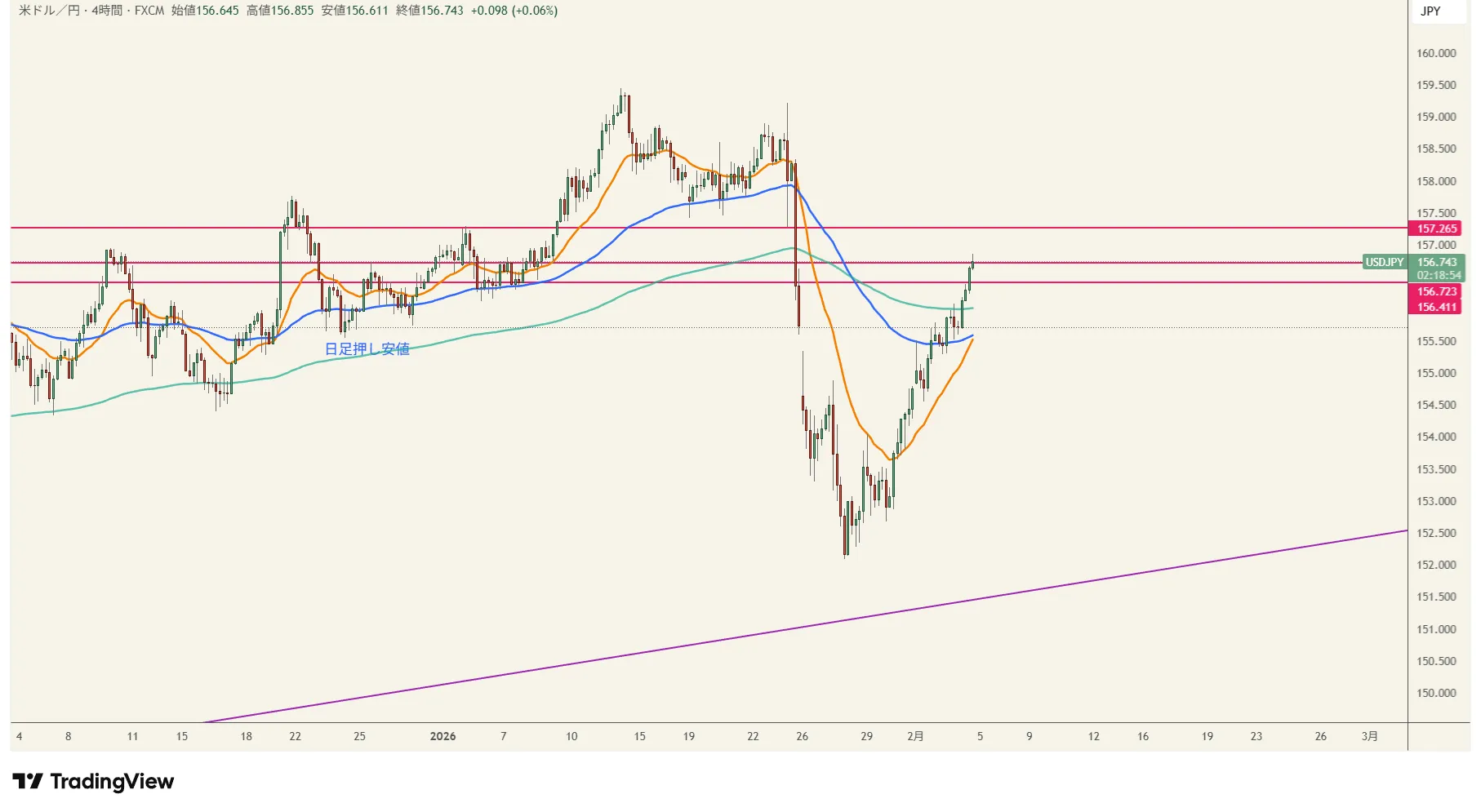 【2026年2月4日 20:45】 【通貨ペア:ドル円】 【本日のスタンス】買い方向。 〇方向性:15分足で20EMAで買い。ただし、NY時間に深い押し目が入った場合、75EMAまで押してくる可能性あり。 〇現状:押し目待ち 〇基本方針:NY時間次第。20EMAでの反発が多いが、少し深めの押し目がくる可能性あり。 〇条件未達時:ノートレード 【環境認識(上位足)】 4時間足:サポートラインにあたり、ややもたついている。ここから一旦の押し目狙い。 【短期足の見方】 ※無理に入る必要はありません ① パターン①(難易度:中) 条件:20EMAあたりで買い 損切:直近安値156.4 コメント:NY時間次第。 ② パターン②(難易度:高) 条件:75EMAで買い 損切:直近安値156.2 コメント:20EMAを抜けてきた段階で検討 ③ 見送り条件:エントリー条件でなければ見送り 【資金管理・トレード設計】 利確目標:157.2 パターン1 RR:1:1.3 パターン2 RR:1:7 リスク:24:00にSランク指標あり。それまでに決済。証拠金に対するリスクは0.5~1%。 【上位足の重要ライン】 価格帯:157.2 意味:日足のレジスタンスライン 本日は、Sランク指標あり。早めの決済がいいですね。
