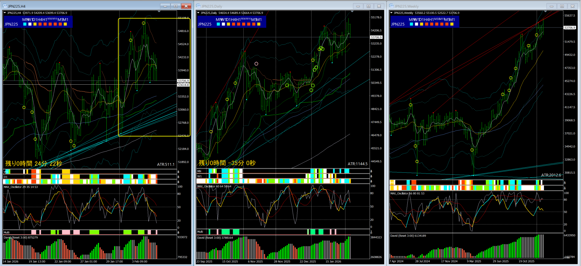 一方で、週足のMAXオシレーター、シンクロバンドは「中立」を示唆
