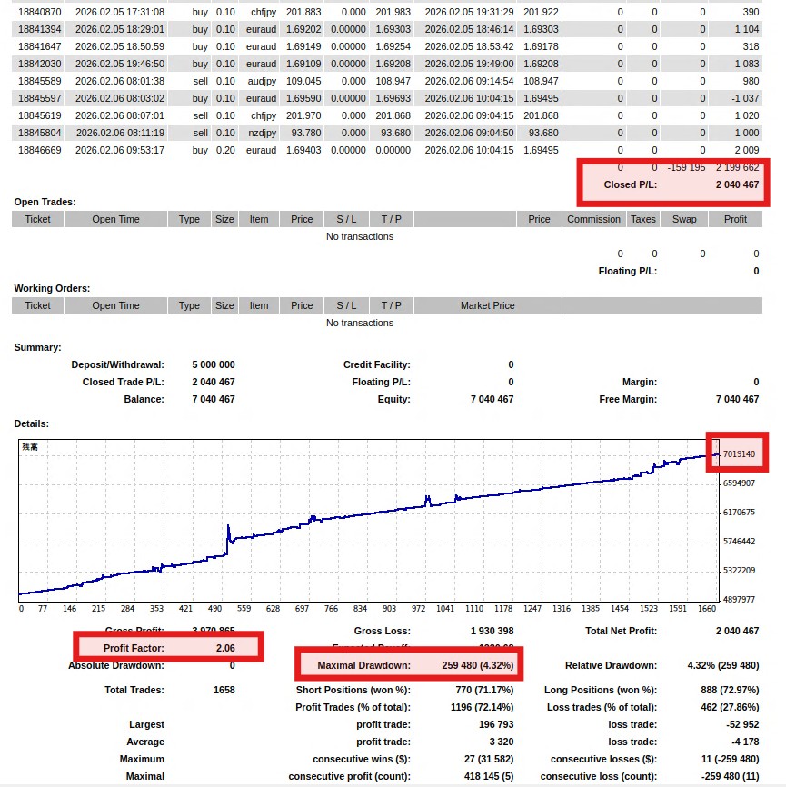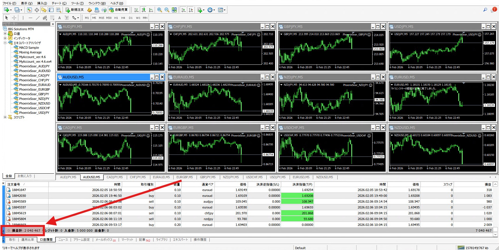 軍資金:500万円、レバレッジ 0.1Lot 設定 PhoenixSoarで使用可能な全11通貨ペア運用