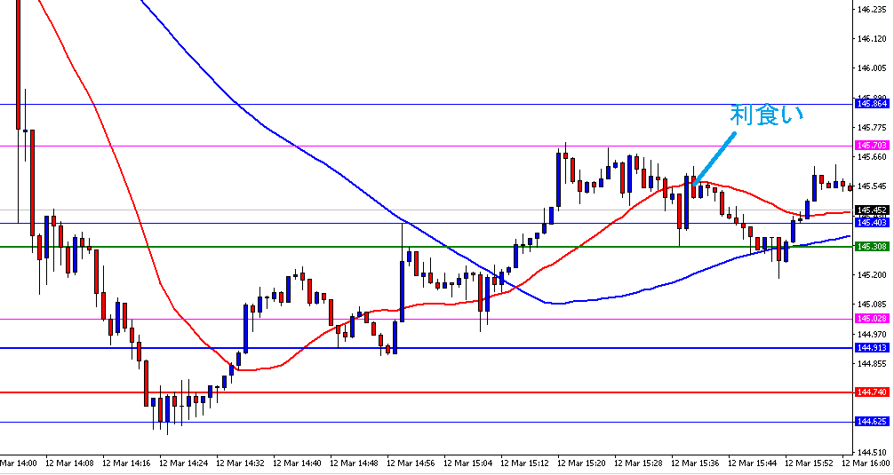 利食いしたあと下がっていきました。うまく逃げれました。小さい値幅に見えますが20pipsくらい取れました。